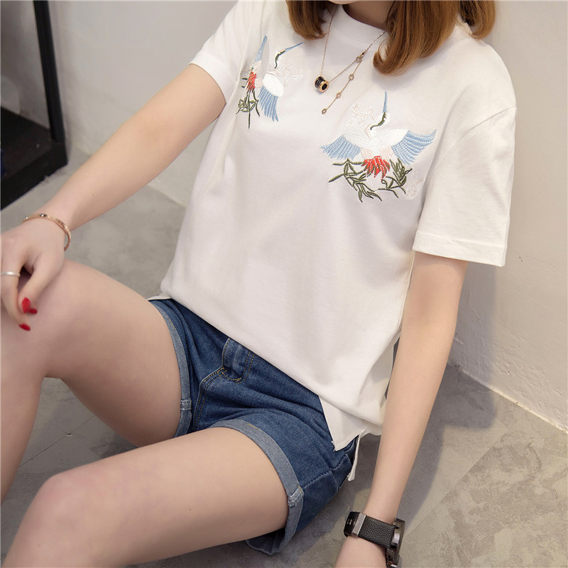 春季新款女裝上衣刺繡白色t恤女短袖寬松韓版打底體恤衫女潮