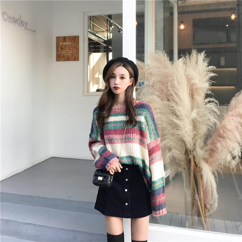 / 早秋復古拼色彩條懶惰風寬松毛衣+顯瘦高腰燈芯絨A字裙時尚兩件套