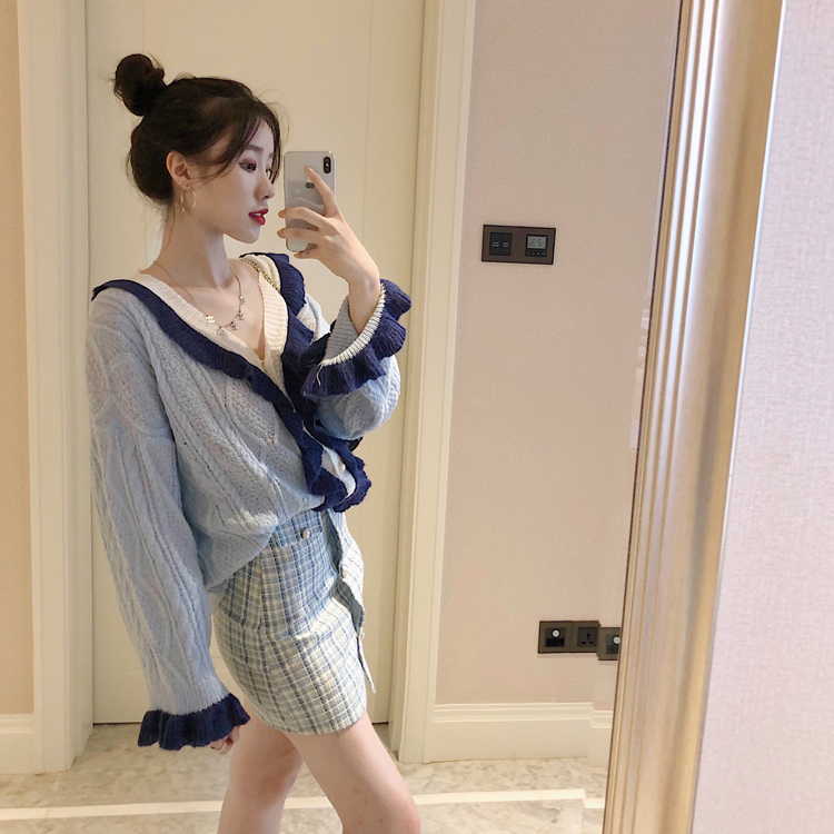 / 2018秋裝新款韓版港風時尚套裝荷葉邊V領開衫粗花呢氣質格子半裙