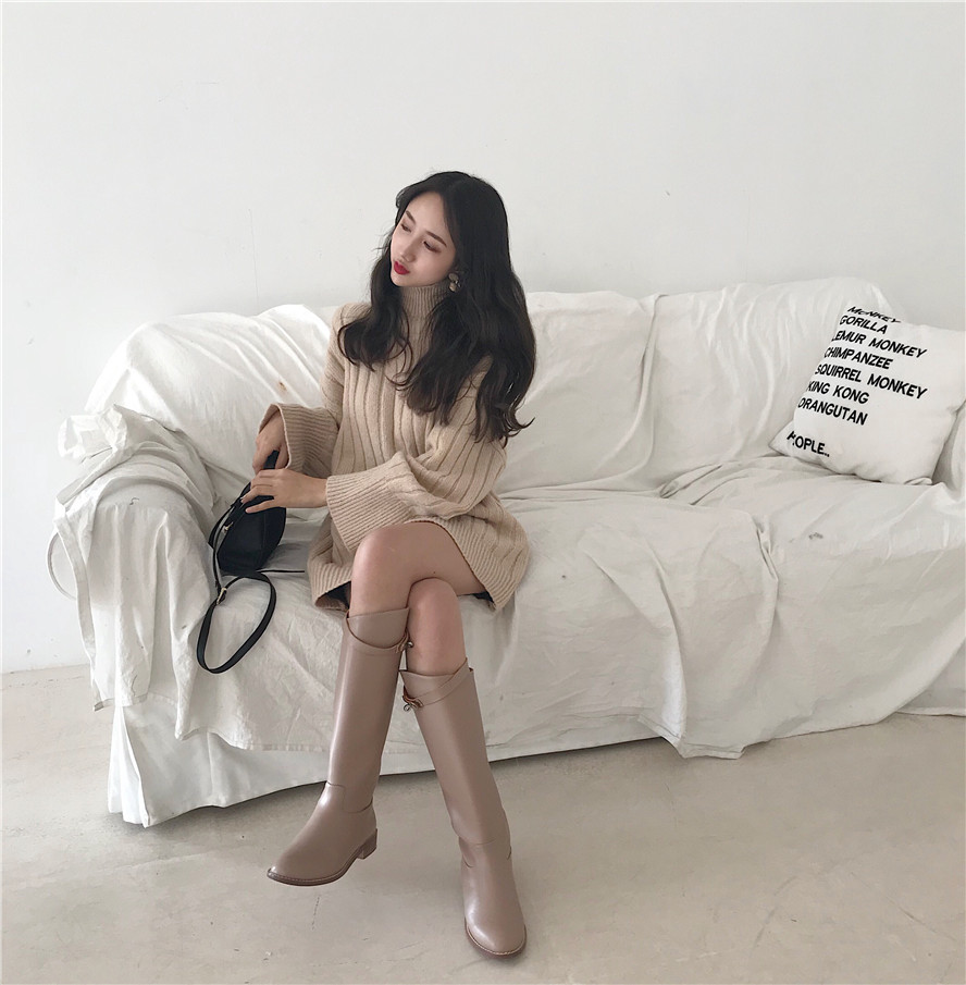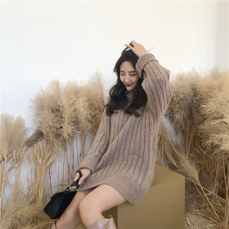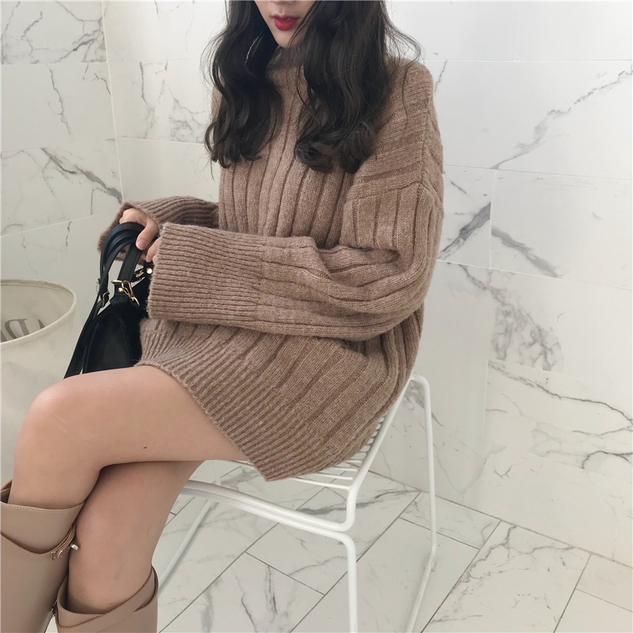 / 韓國chic秋裝新款時尚慵懶半高領質感坑條毛衣針織衫中長款上衣女