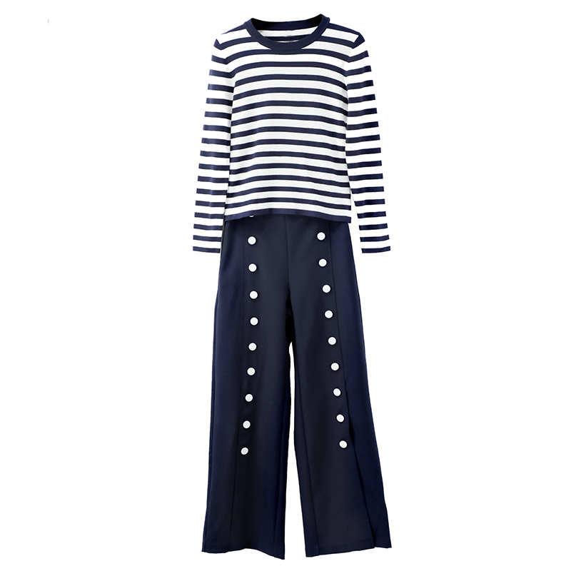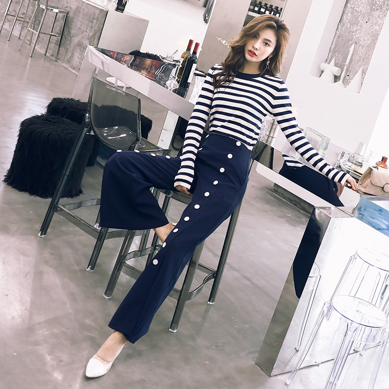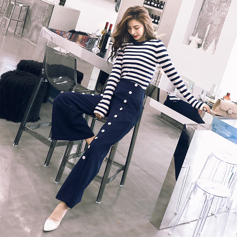 2018新款洋氣套裝女秋裝條紋針織衫長袖上衣高腰闊腿長褲兩件套潮