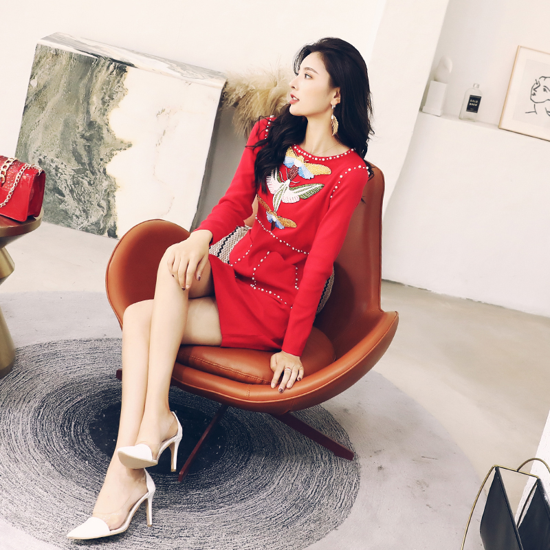 / 針織連衣裙早秋裝2018新款女裝氣質長款修身包臀釘珠重工一步裙子