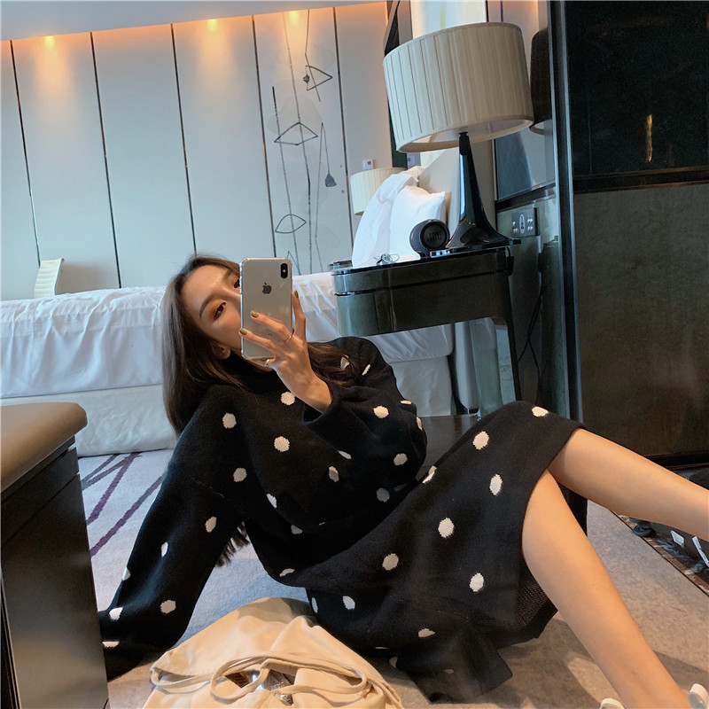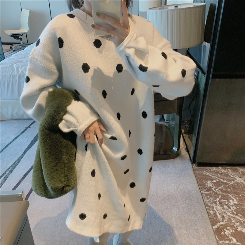 / 連衣裙女秋冬新款chic慵懶風寬松厚實波點長袖圓領中長款毛衣裙潮