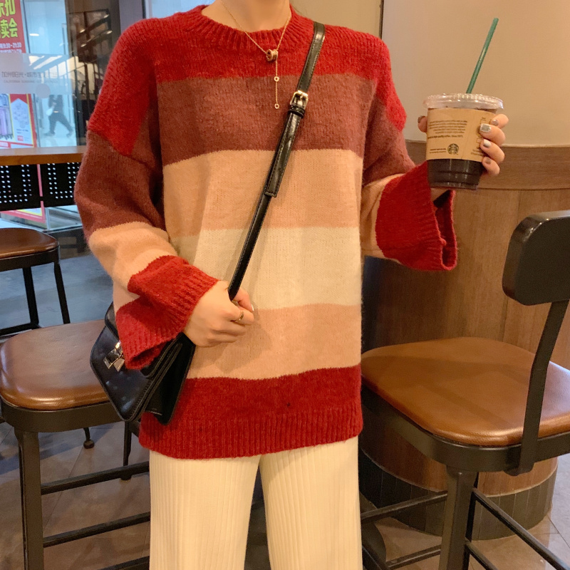 復古甜美軟糯不起球彩虹毛衣+小清新雪紡高腰半身裙套裝兩件套潮