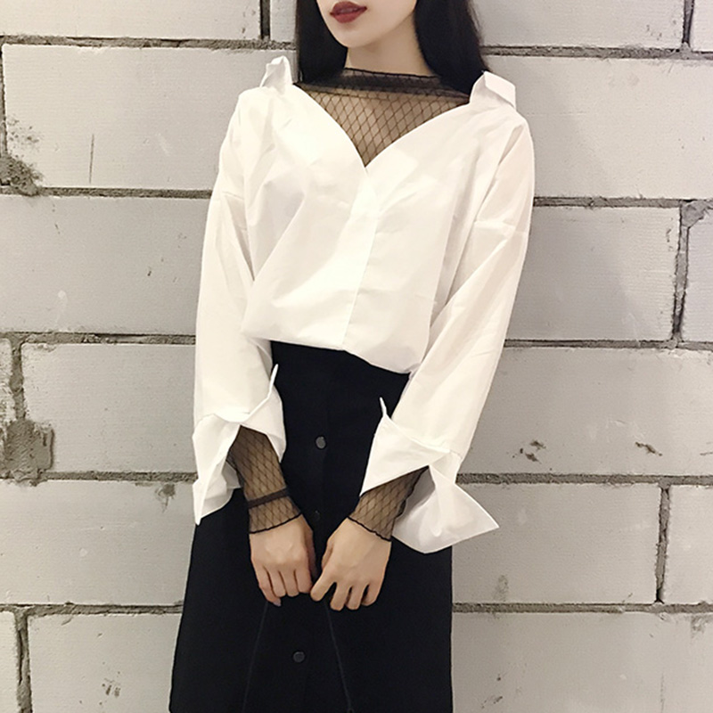 / 學生休閑襯衫早秋2018新款女裝港味條紋拼接網紗假兩件寬松上衣潮