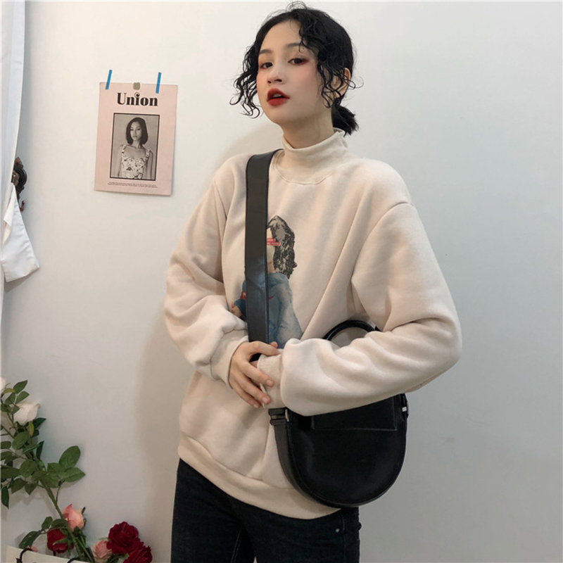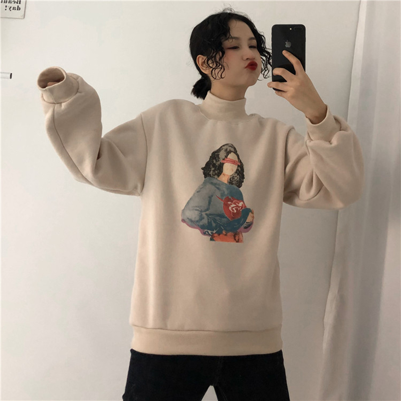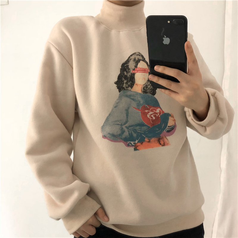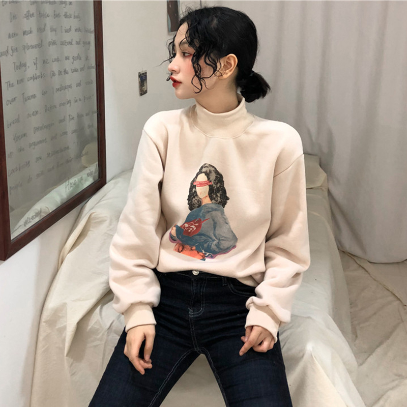 女冬裝2018新款韓版慵懶寬松半高領加絨衛衣時尚人物圖案長袖外套