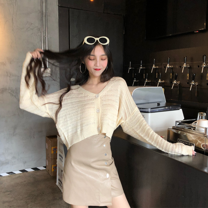 / 港味時尚套裝chic早秋上衣慵懶針織毛衣開衫+百搭高腰皮裙兩件套