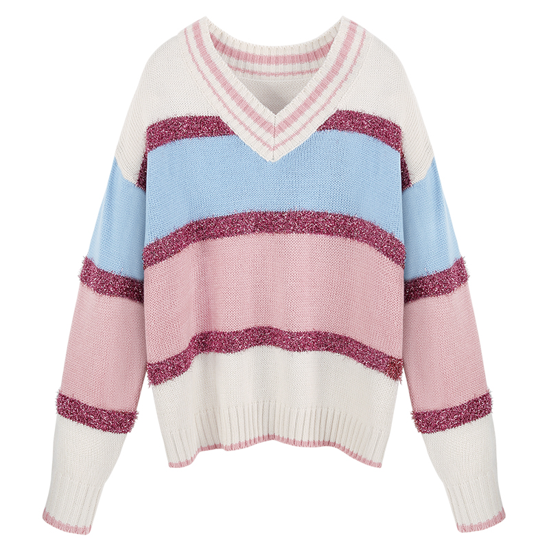 MG小象亮絲條紋毛衣女2018新款v領套頭上衣冬季寬松針織毛線衣潮