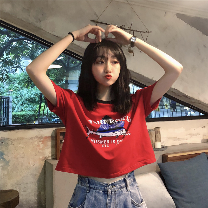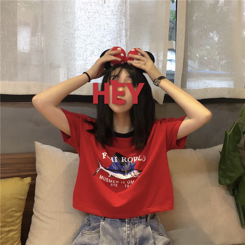 馨幫幫 年代女郎~韓版拼色領印花T恤女港味chic復古學生短款上衣