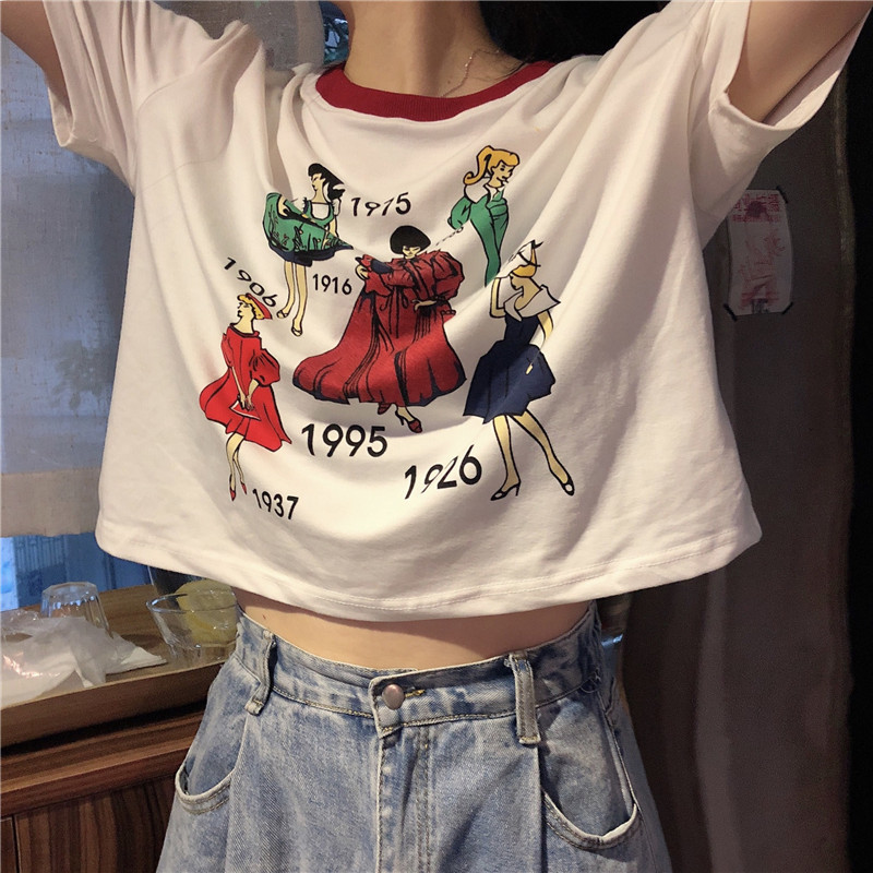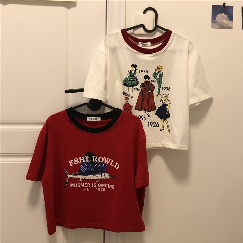 / 馨幫幫 年代女郎~韓版拼色領印花T恤女港味chic復古學生短款上衣