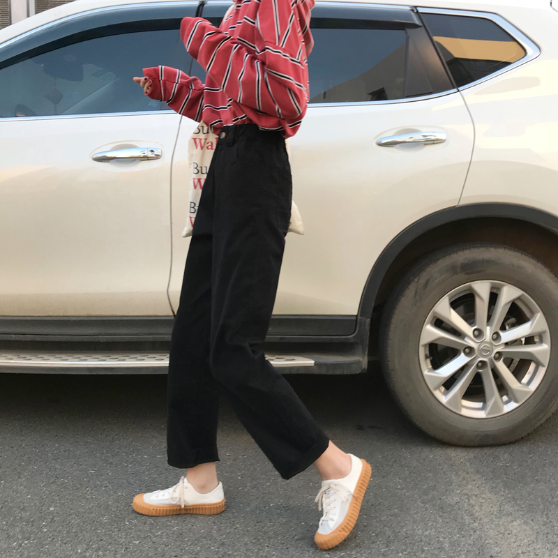 秋季女裝韓版松緊腰寬松復古休閑褲工裝褲子高腰直筒褲闊腿褲長褲