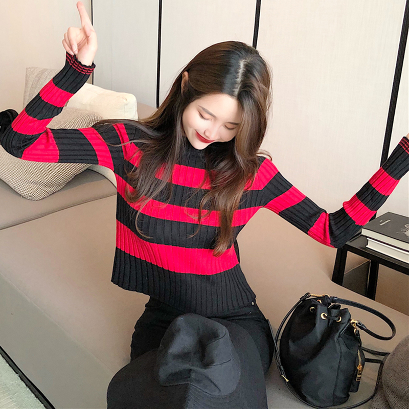 / 條紋針織衫女2018新款復古港風修身長袖打底衫洋氣圓領短上衣秋裝