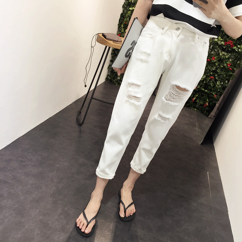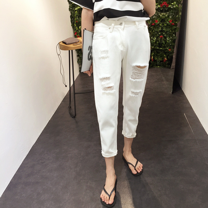春季女裝韓版寬松流蘇破洞白色低腰牛仔褲女學生顯瘦小腳哈倫褲潮
