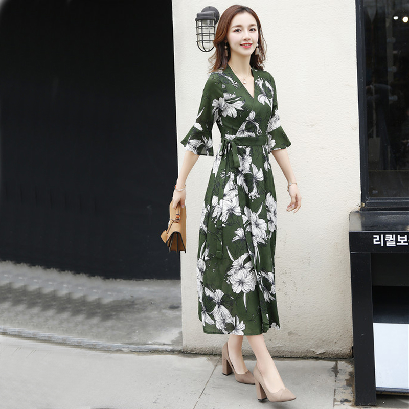 / 夏季波西米亞印花V領沙灘收腰雪紡連衣裙露肩過膝大擺長裙女