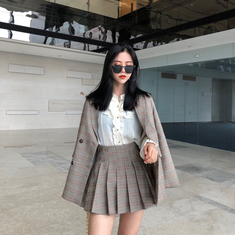 / 新款女格子西裝外套高腰百褶半身裙九分褲西褲三件套港風時尚套裝