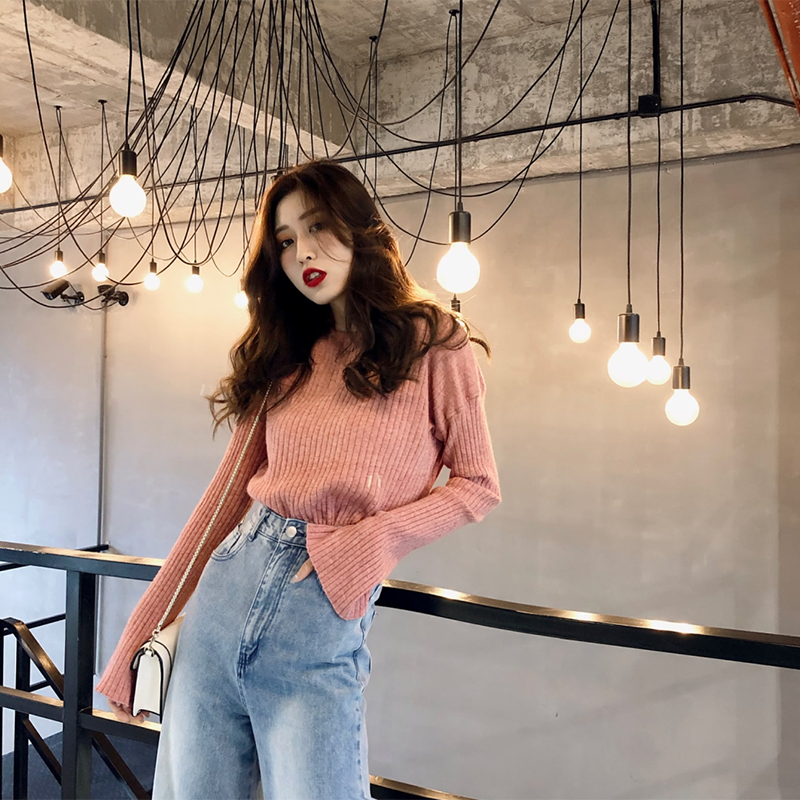 港味女裝上衣2018新款復古修身顯瘦百搭半高領純色長袖針織打底衫