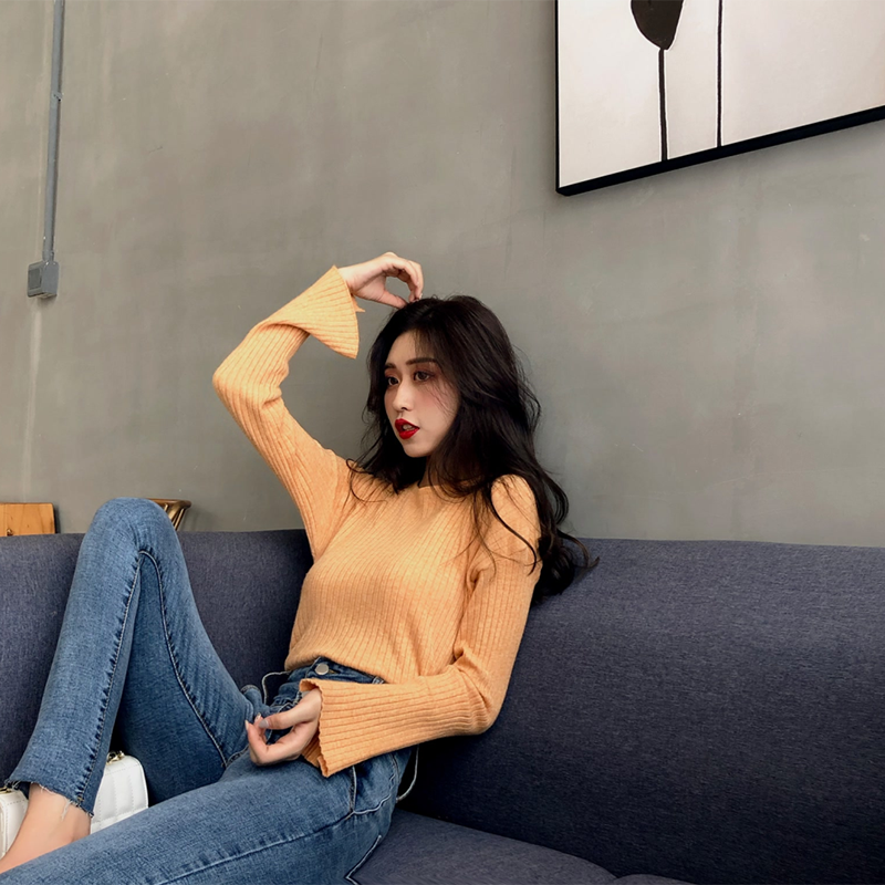 / 復古時尚純色百搭修身坑條長袖打底針織衫女學生韓版chic早秋上衣