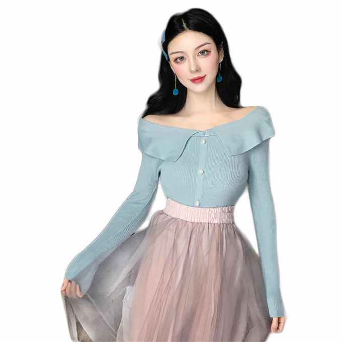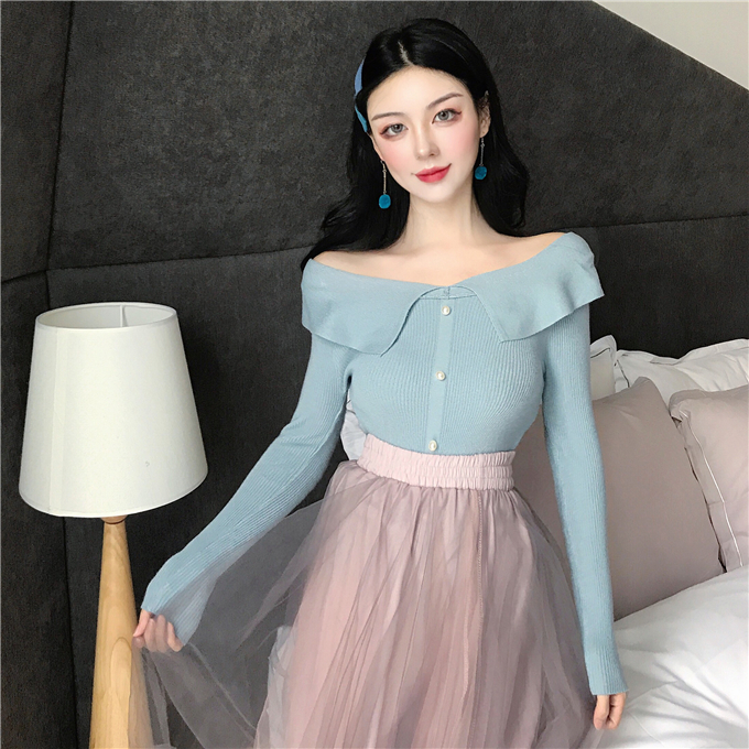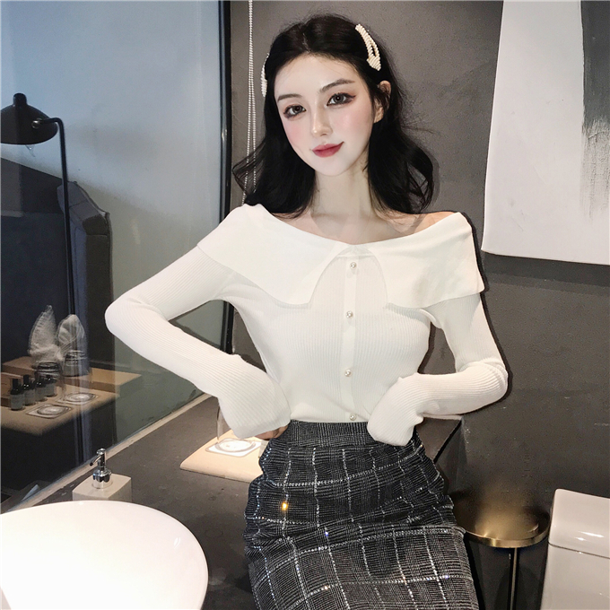 / 慵懶風套頭毛衣女2018新款秋冬一字肩翻領珍珠顯瘦修身長袖針織衫