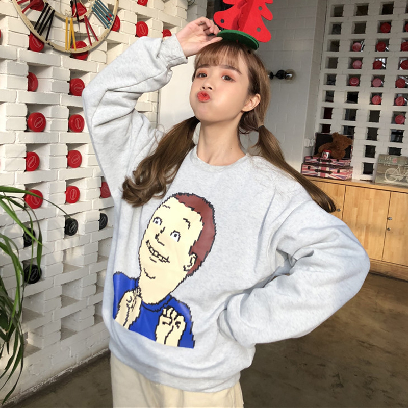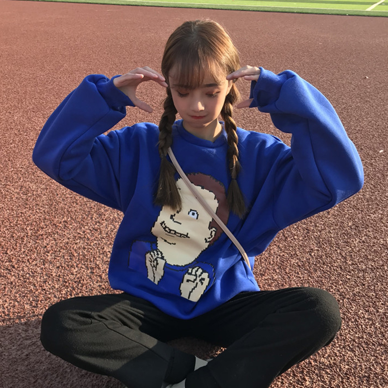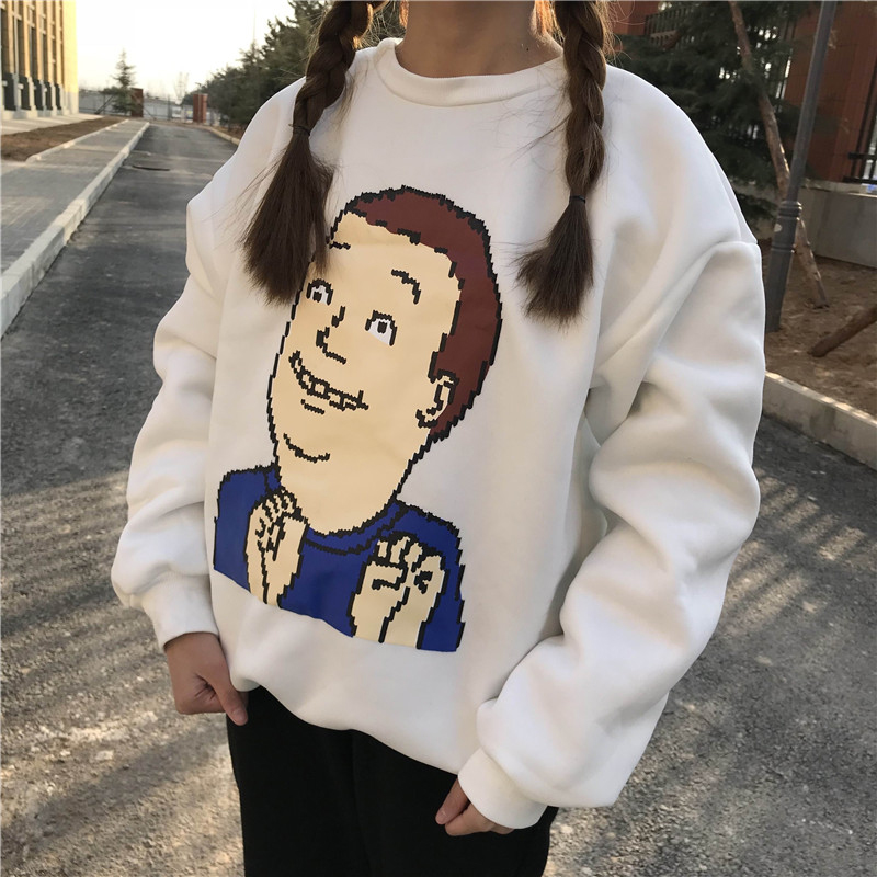 pp home寬松套頭加絨衛衣女冬裝2018新款原宿風卡通人物印花外套