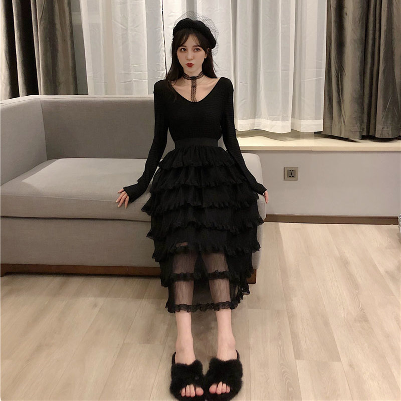 / 2018秋冬港味新款時尚V領打底蛋糕裙網紗蕾絲黑色中長款連衣裙女