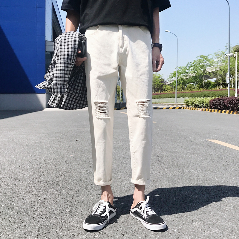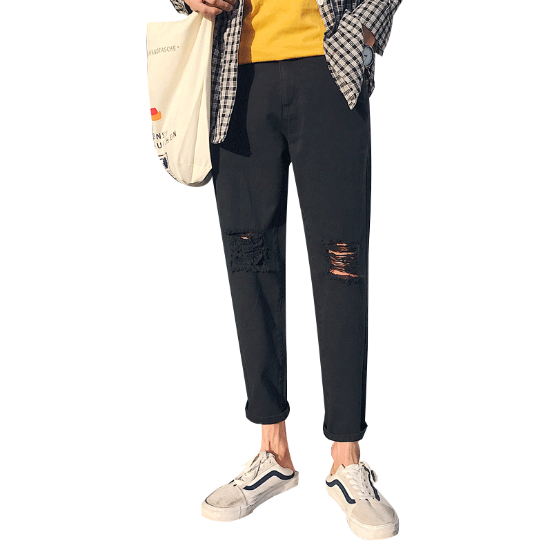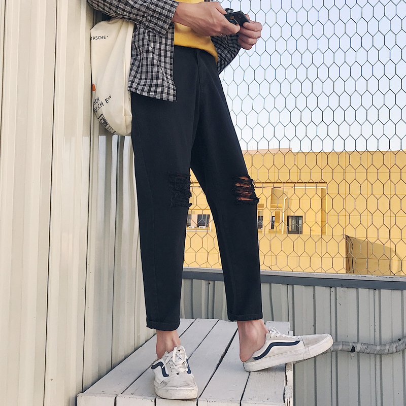 / 秋季褲子男韓版潮流休閑褲運動九分褲破洞百搭新款男褲港風乞丐褲