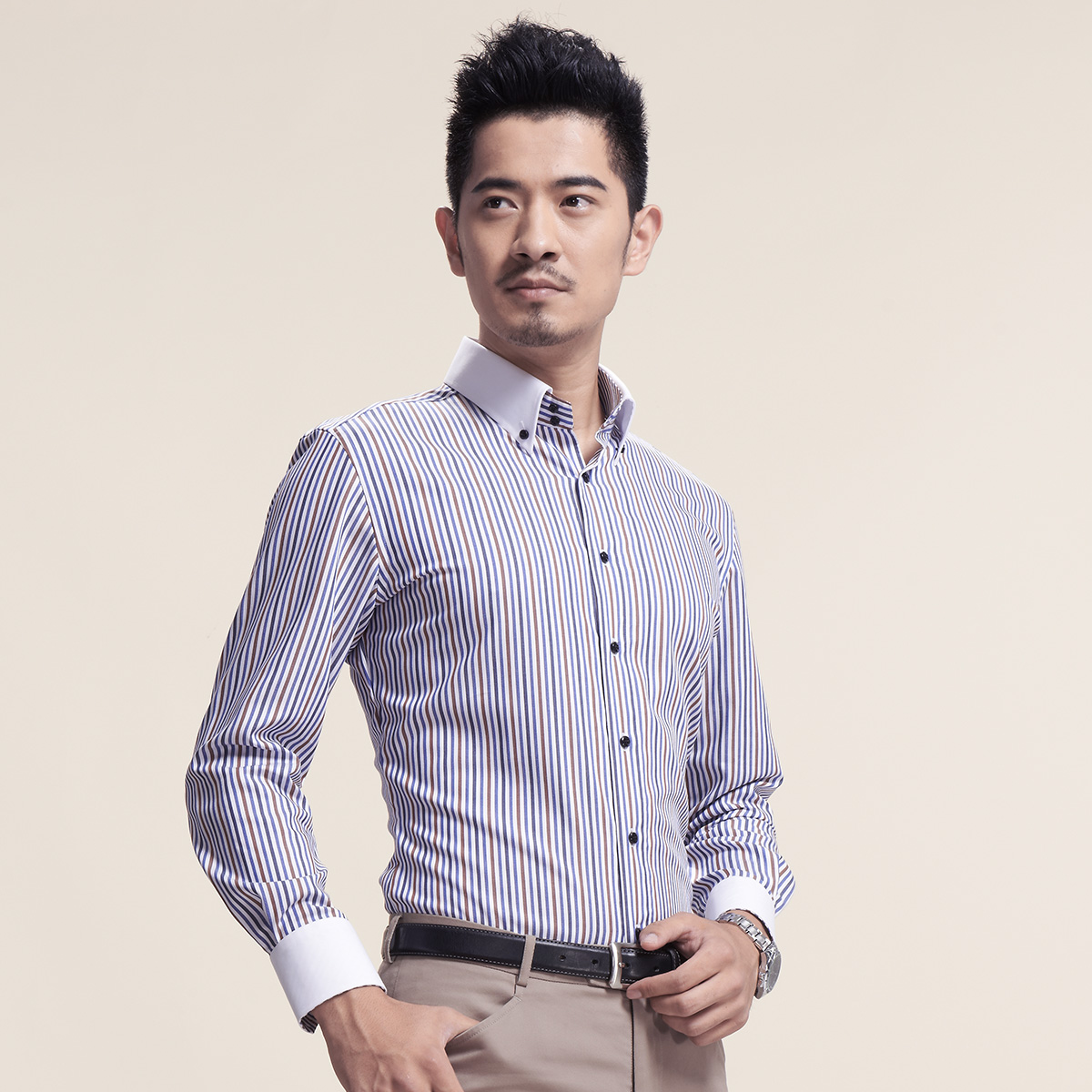 / 男士釘扣領豎條紋襯衫時尚都市襯衫襯衣男長袖韓版修身潮男裝