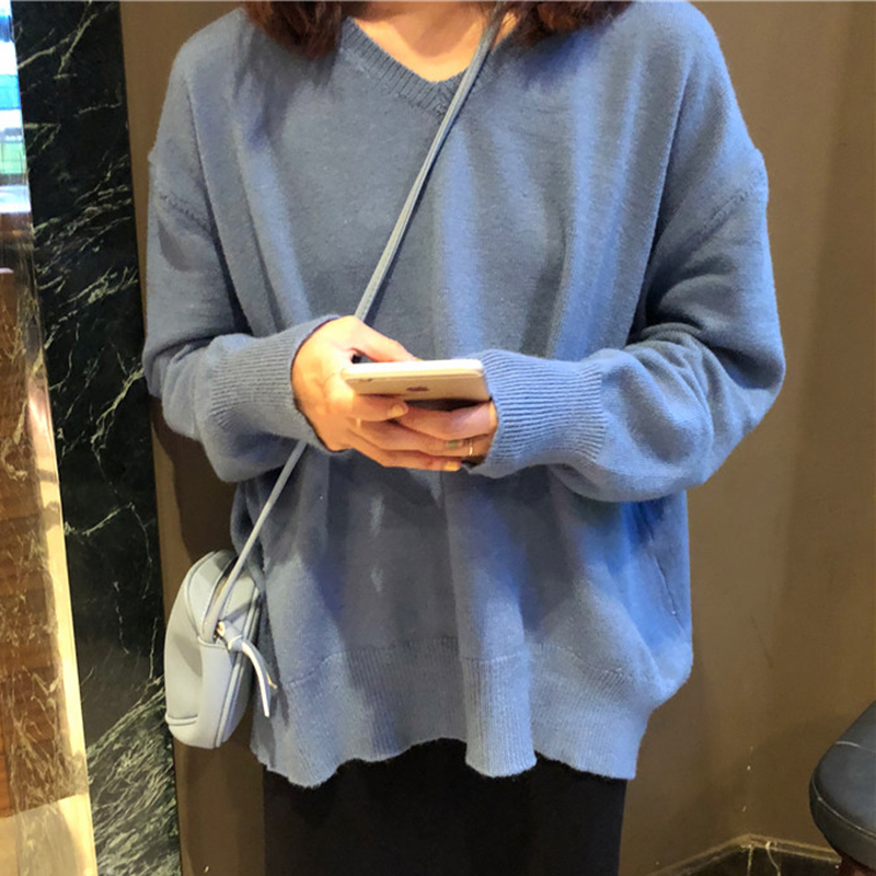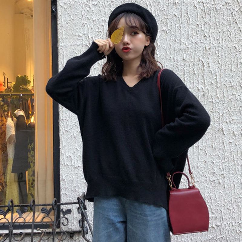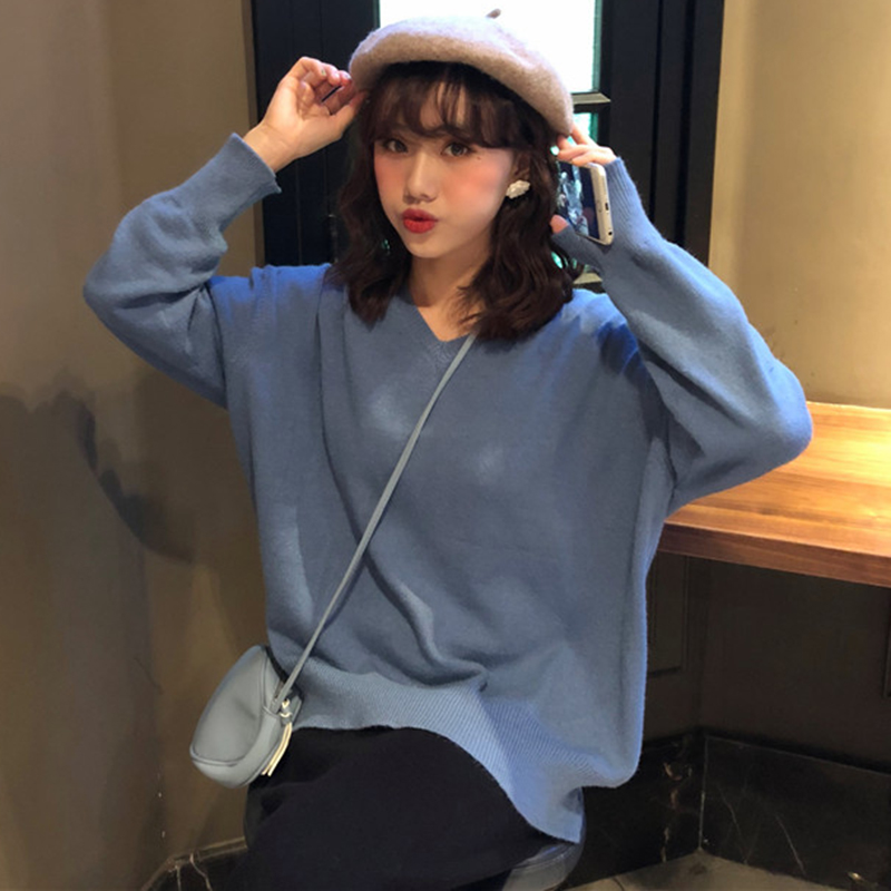 秋冬女裝2018新款韓版純色長袖套頭針織衫學生寬松V領毛衣外套潮