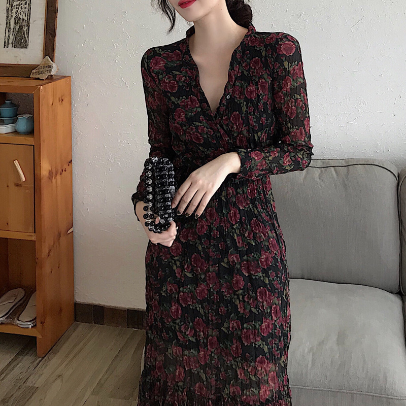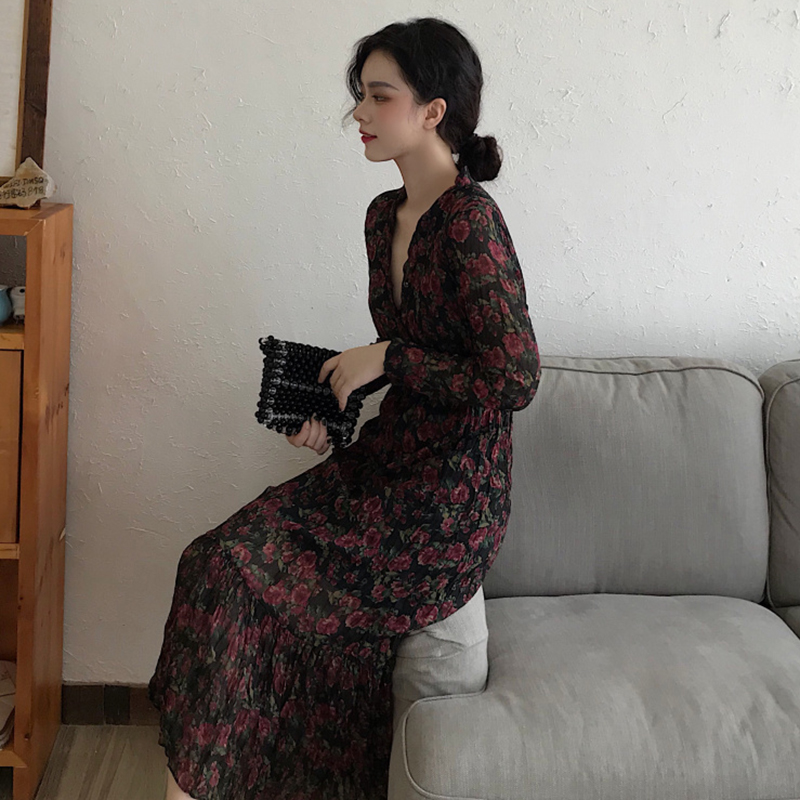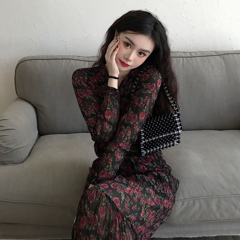 / 秋裝女2018新款港味復古碎花褶皺中長裙氣質V領高腰長袖連衣裙子