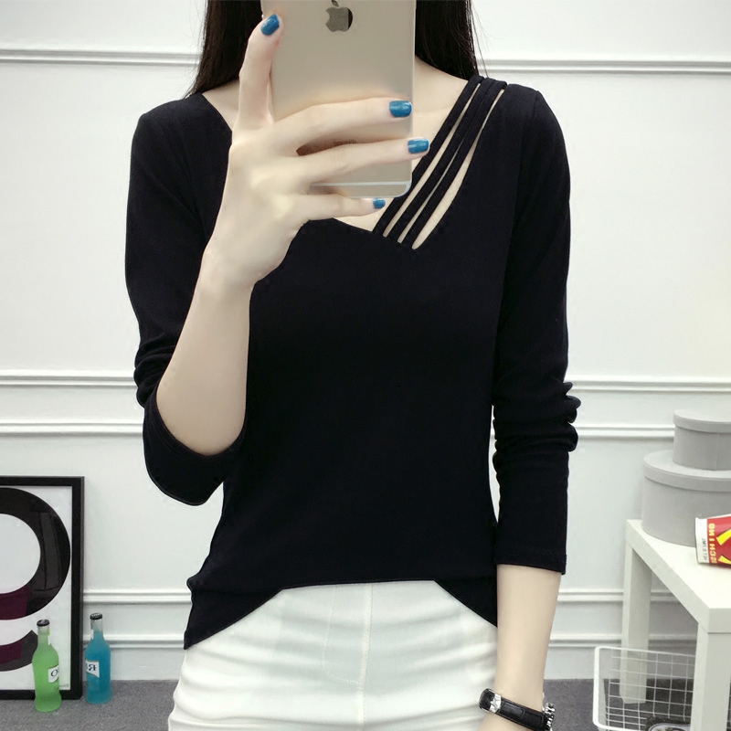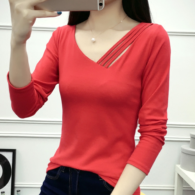 / 長袖女T恤純色棉質V領修身百搭體恤衫秋大碼顯瘦打底衫t桖