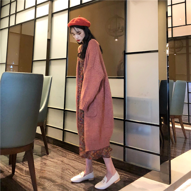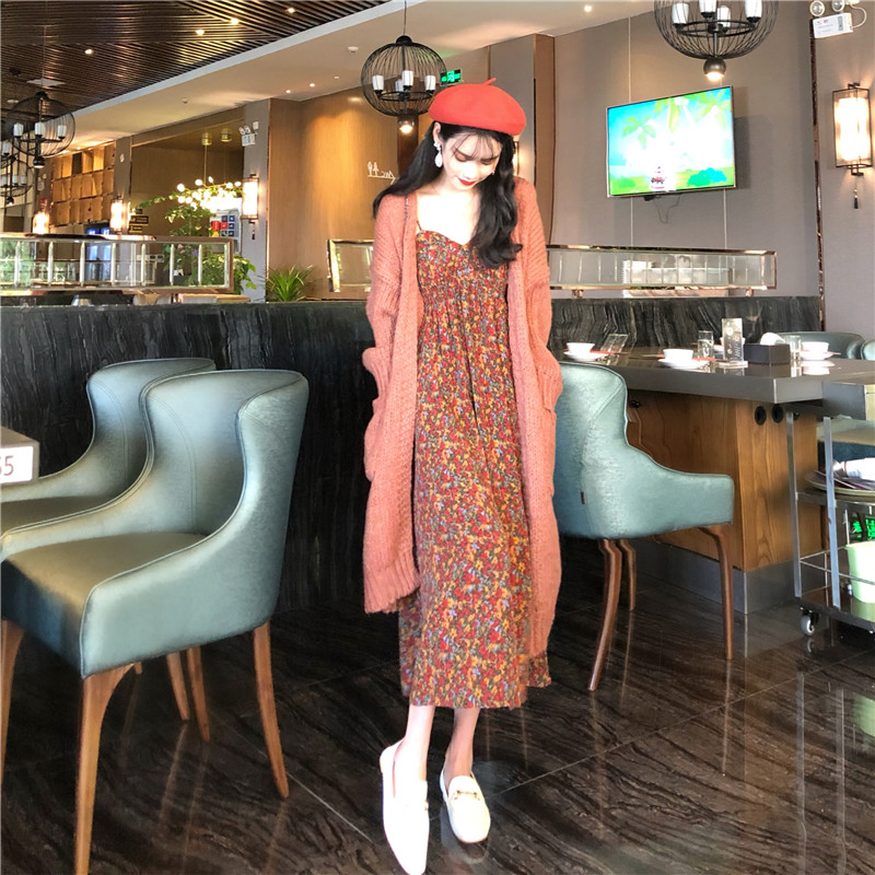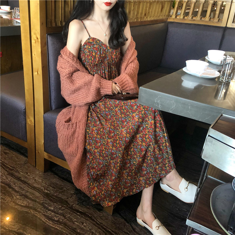 / 韓國復古風收腰顯瘦印花吊帶連衣裙+慵懶寬松百搭毛衣外套套裝女