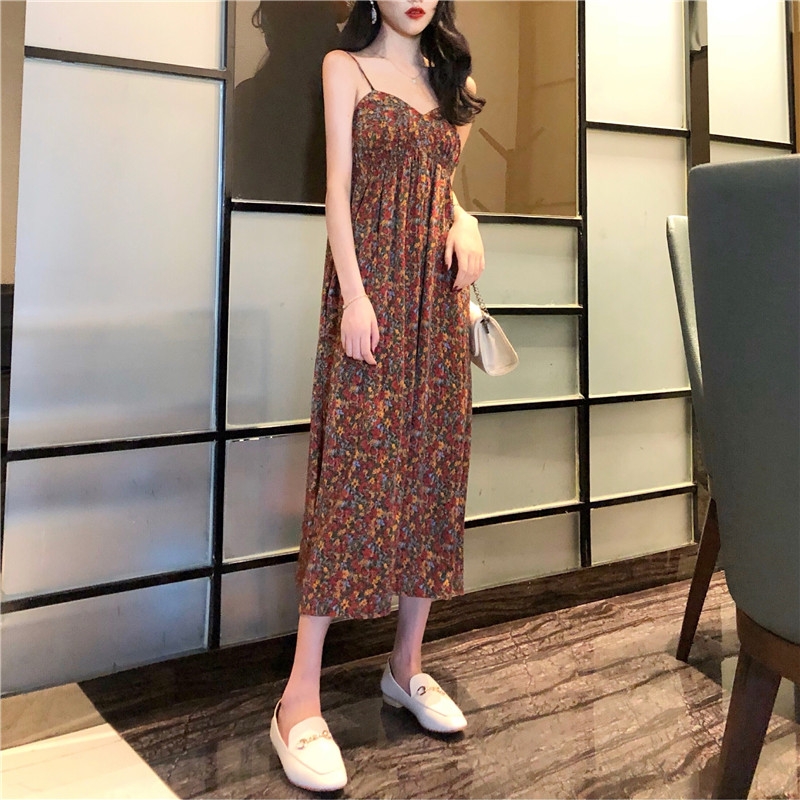 韓國復古風收腰顯瘦印花吊帶連衣裙+慵懶寬松百搭毛衣外套套裝女