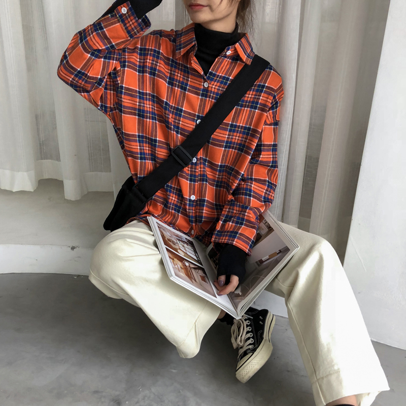 / 復古格子寬松長袖上衣秋裝女2018新款小清新學生慵懶休閑襯衫外套