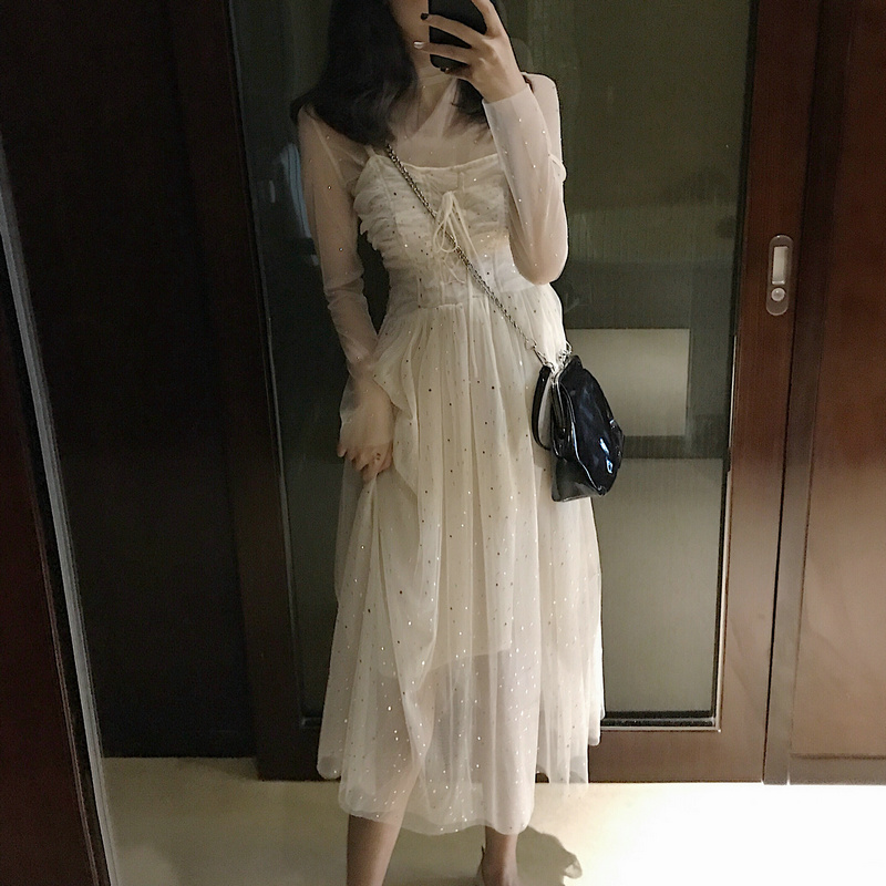 早秋兩件套裙女氣質網紗上衣亮片網紗裙韓版時尚套裝2018新款女裝