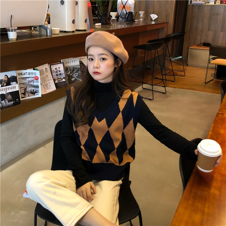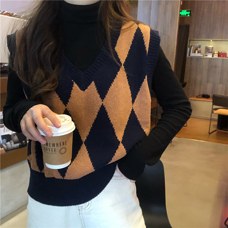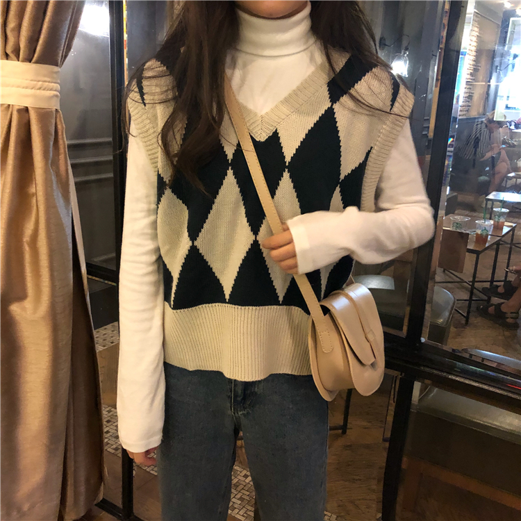 / 韓版時尚休閑套裝秋季女裝菱格V領針織馬甲+高領長袖打底衫兩件套