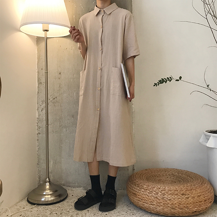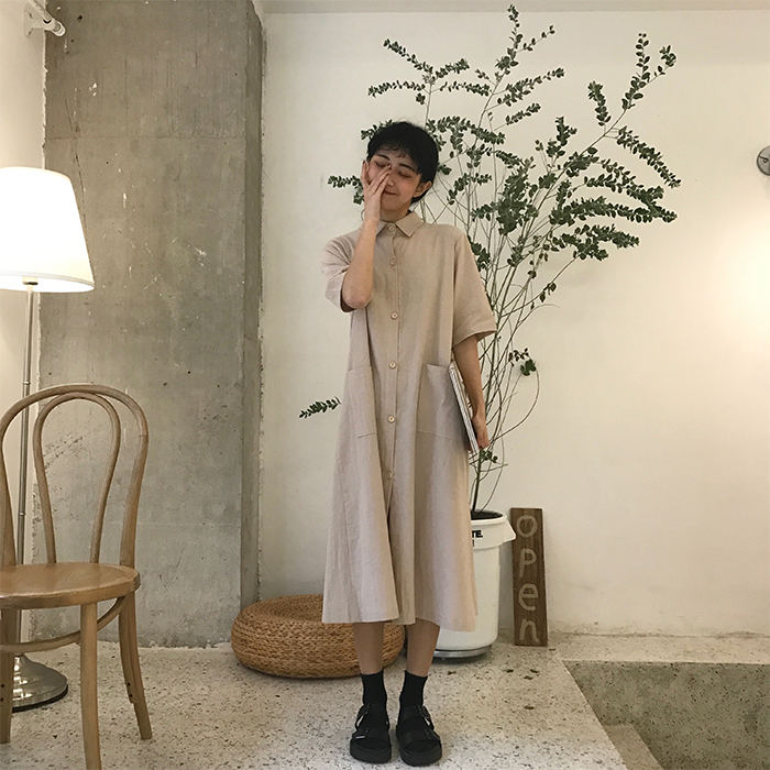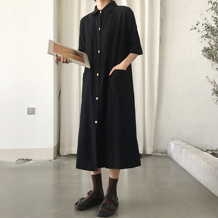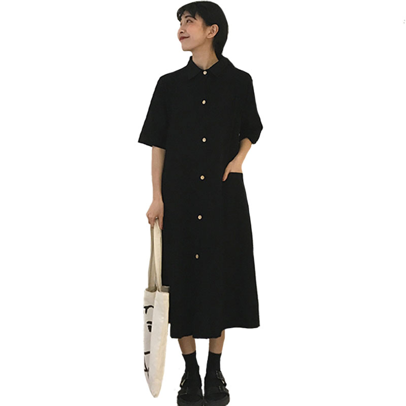 / 秋裝女裝韓版氣質中長款寬松單排扣短袖襯衫連衣裙a字裙長裙顯瘦