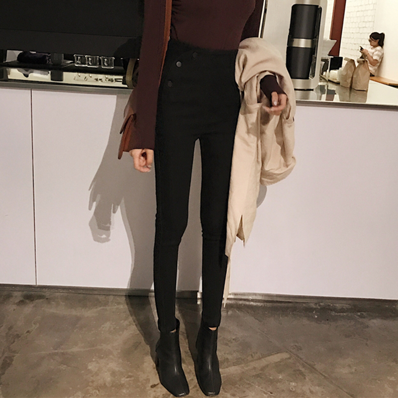 / 時尚排扣高腰緊身小腳鉛筆褲子秋裝女2018新款修身顯瘦黑色牛仔褲