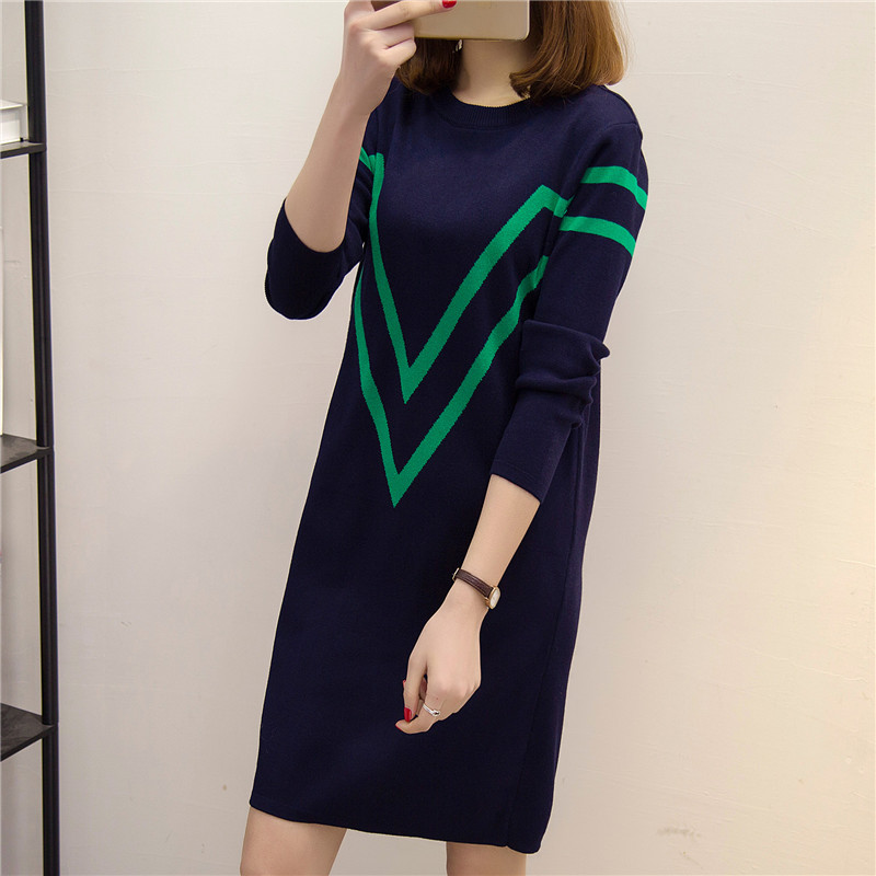 / 條紋針織衫套頭毛衣女秋冬季女裝連衣裙中長款長袖寬松新款潮