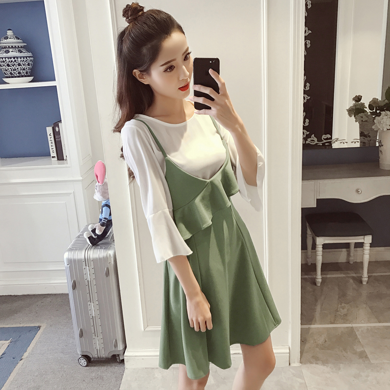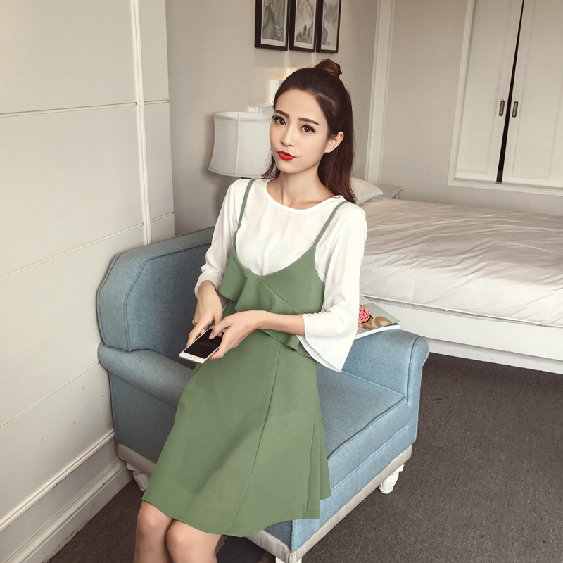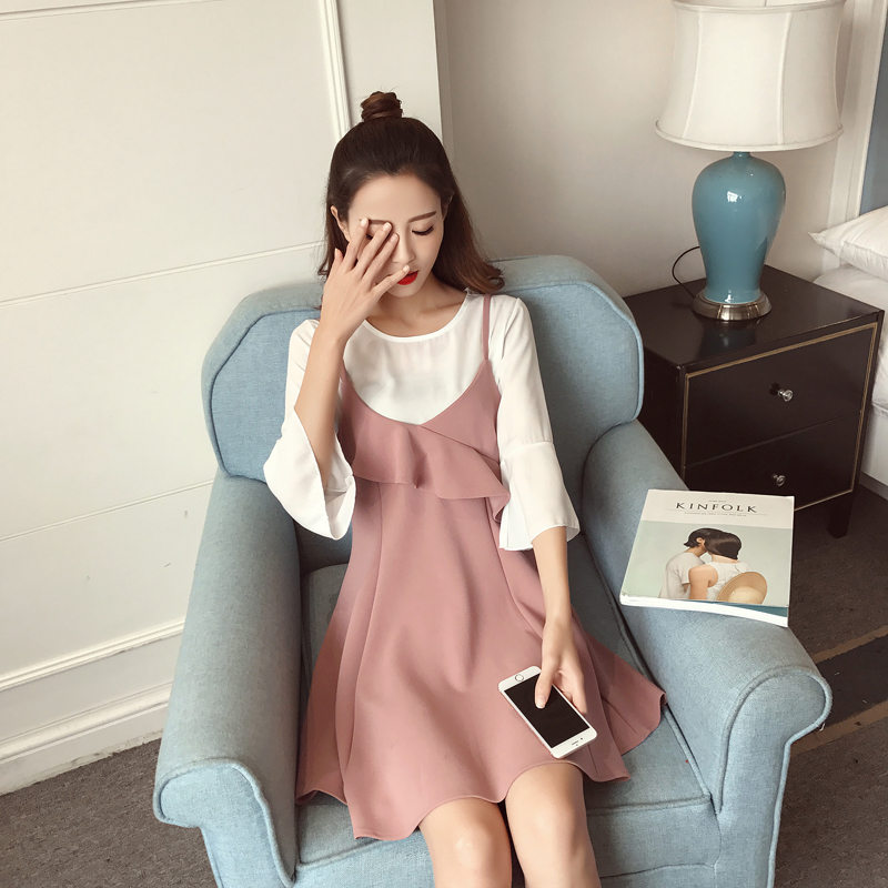 / 春夏季新款女裝韓版荷葉邊吊帶裙兩件套修身七分袖雪紡連衣裙
