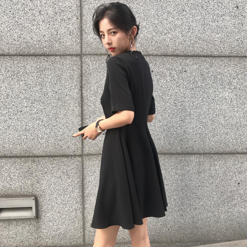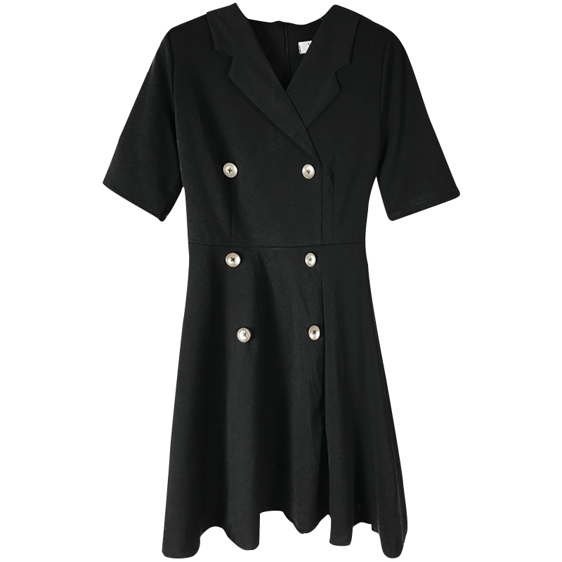 2018新款夏季韓版女裝復古風西裝領短袖小黑裙百搭顯瘦休閑連衣裙