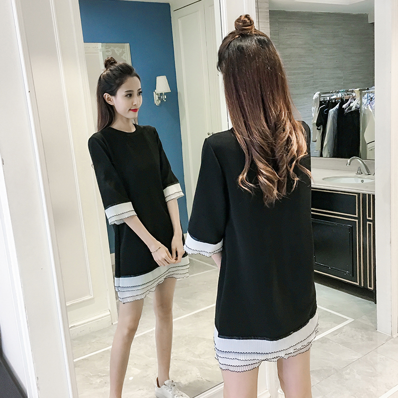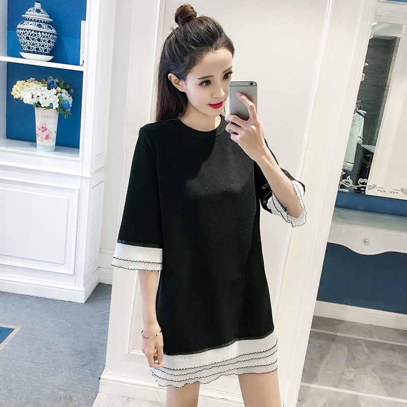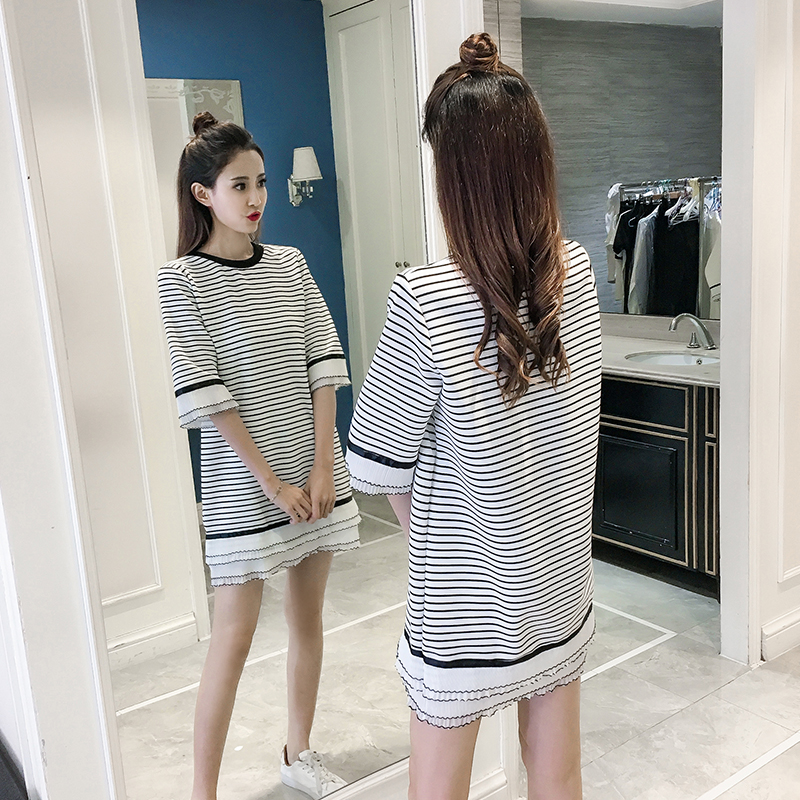 / 春夏新款女裝韓版條紋拼接打底裙中長款寬松顯瘦五分袖連衣裙