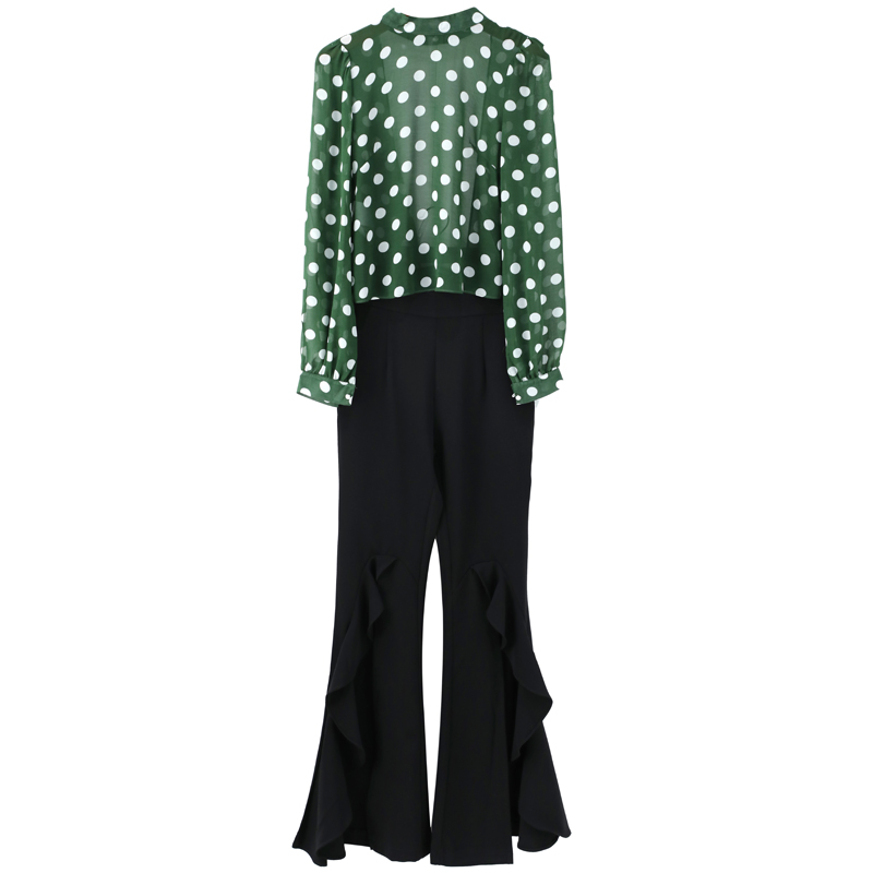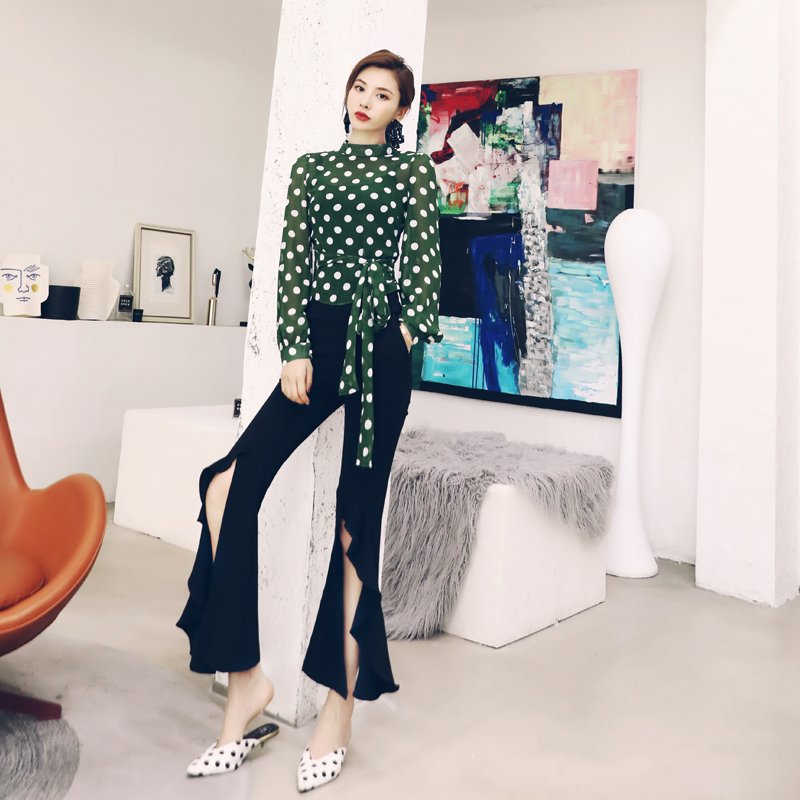 套裝褲女裝秋季2018新款韓版修身收腰波點長袖上衣開叉褲子兩件套