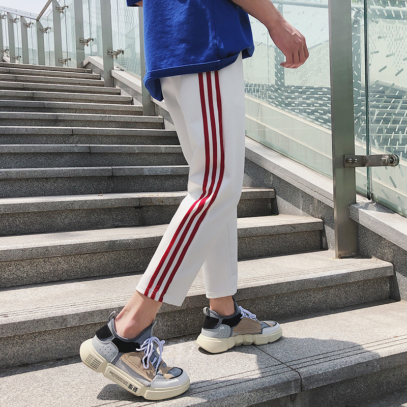 / 秋季褲子文藝男士九分褲條紋韓版潮流休閑褲寬松運動褲男褲款港仔