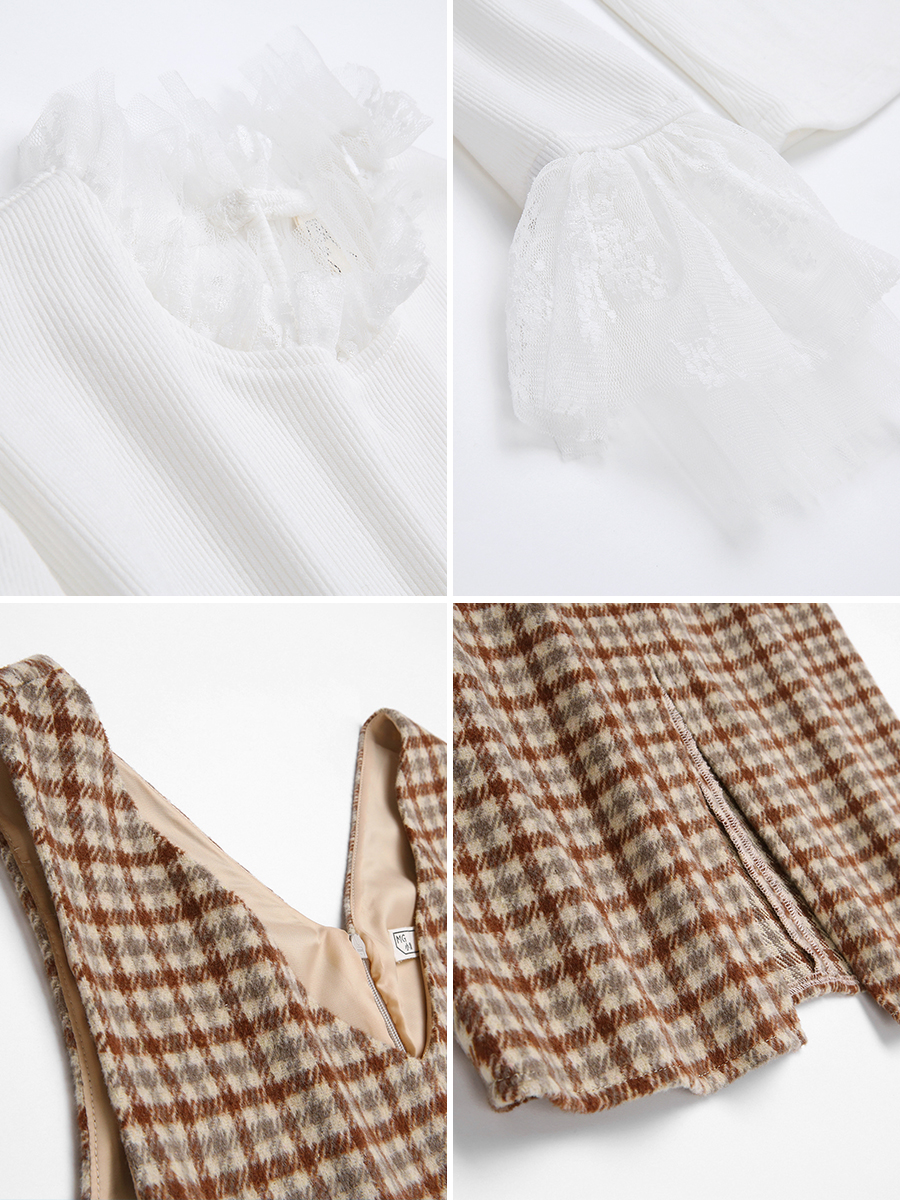 MG小象中長款收腰連衣裙女秋裝新款白色長袖寬松上衣復古格子裙子