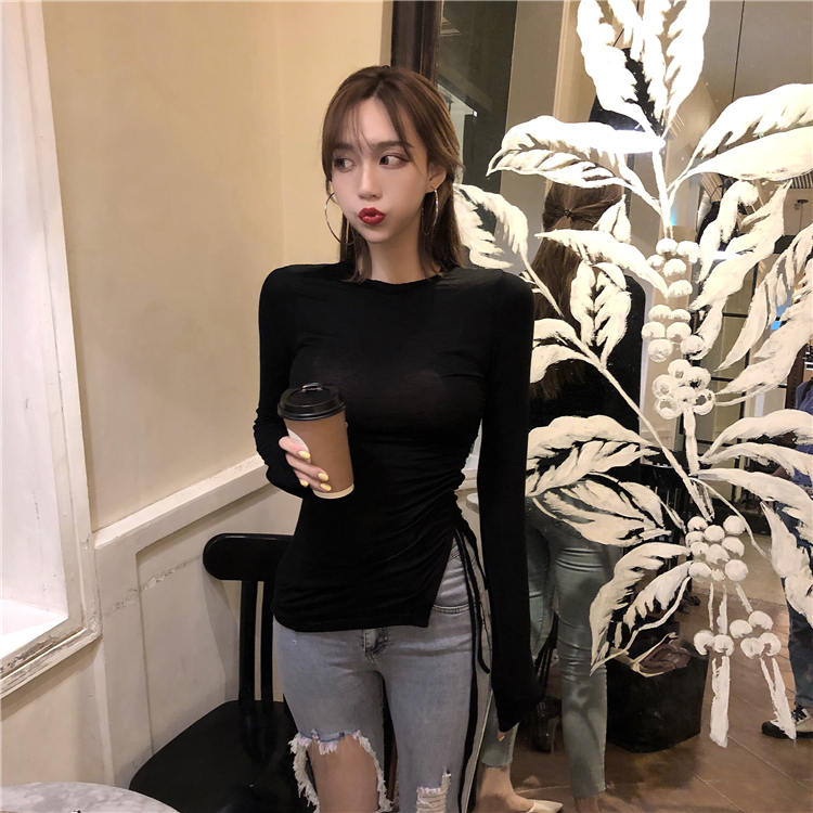 上衣女2018新款韓版修身顯瘦T恤純色圓領長袖復古chic抽繩打底衫
