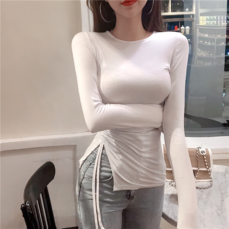 / 上衣女2018新款韓版修身顯瘦T恤純色圓領長袖復古chic抽繩打底衫