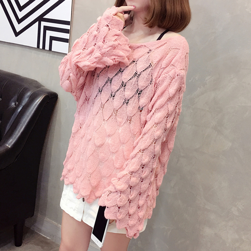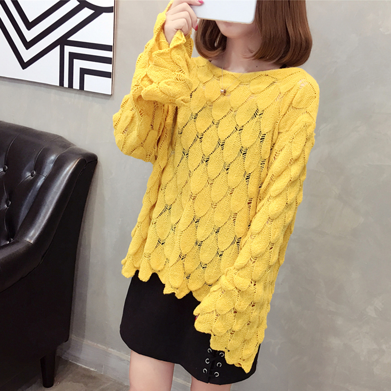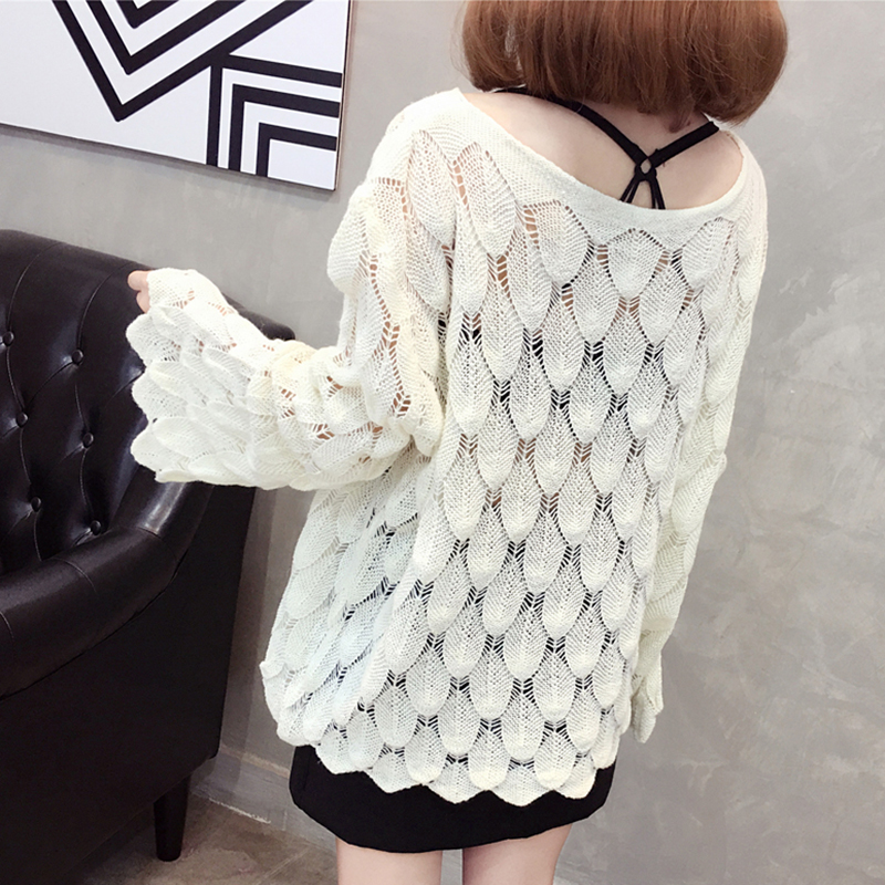 / 鏤空寬松白色針織衫女秋冬裝新款外穿套頭薄款毛衣喇叭長袖上衣潮