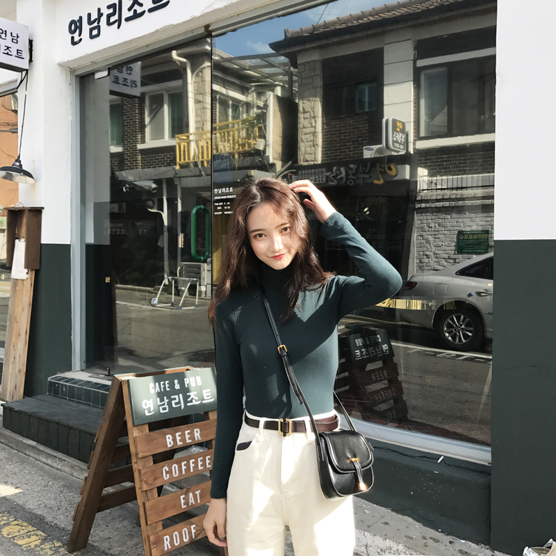 初秋新款女上衣韓版時尚chic基礎款百搭顯瘦高領純色打底衫t恤女