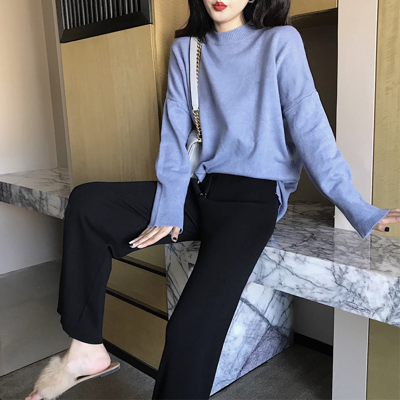 / 港味chic復古寬松圓領套頭慵懶風毛衣女長袖+針織闊腿長褲兩件套