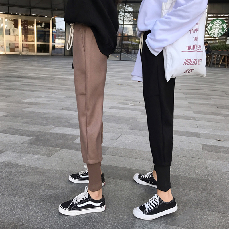 / 假兩件小腳休閑褲子女秋冬裝新款高腰顯瘦學生黑色寬松哈倫九分褲