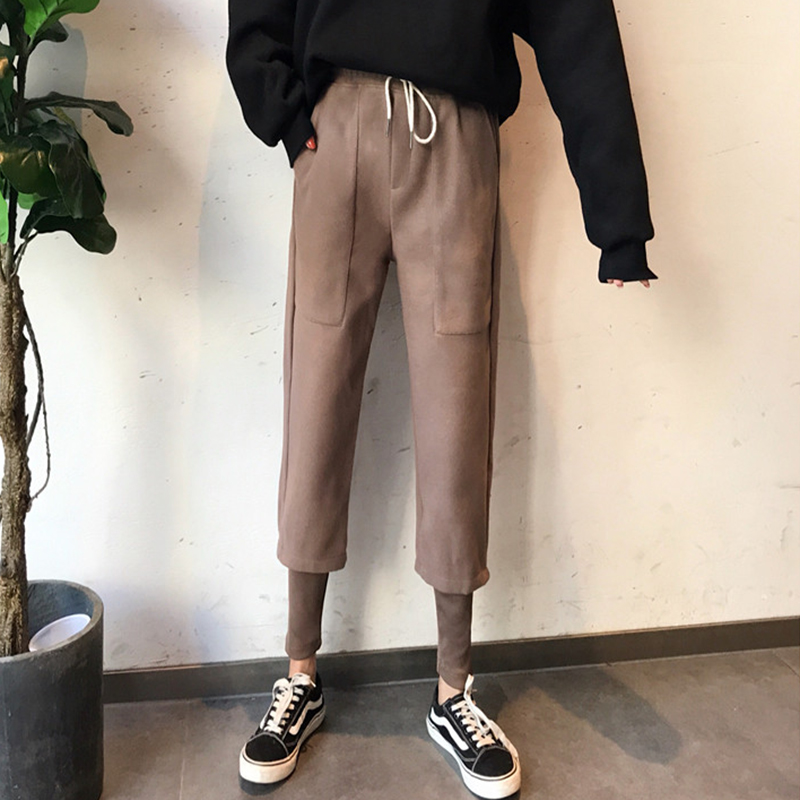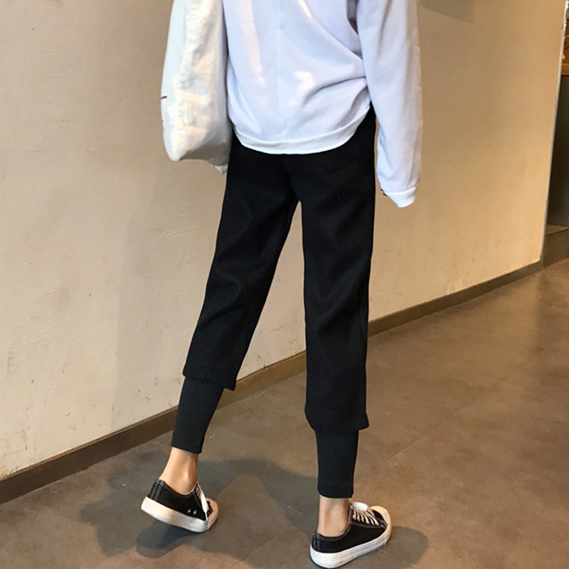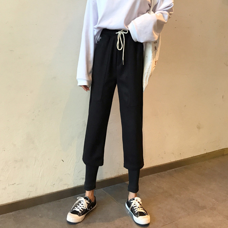 假兩件小腳休閑褲子女秋冬裝新款高腰顯瘦學生黑色寬松哈倫九分褲